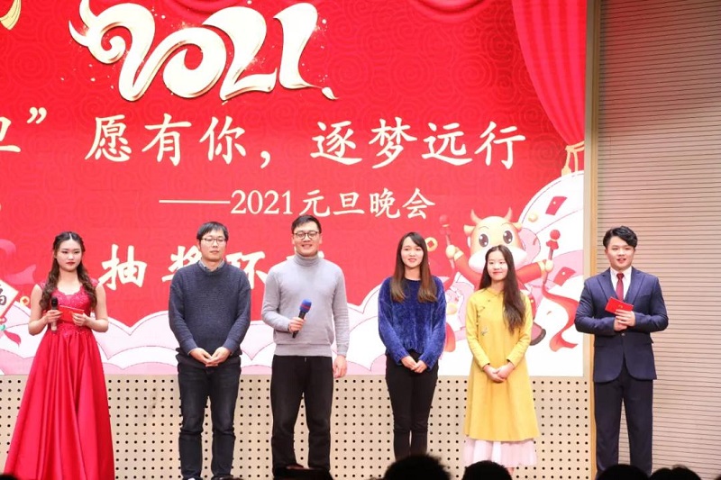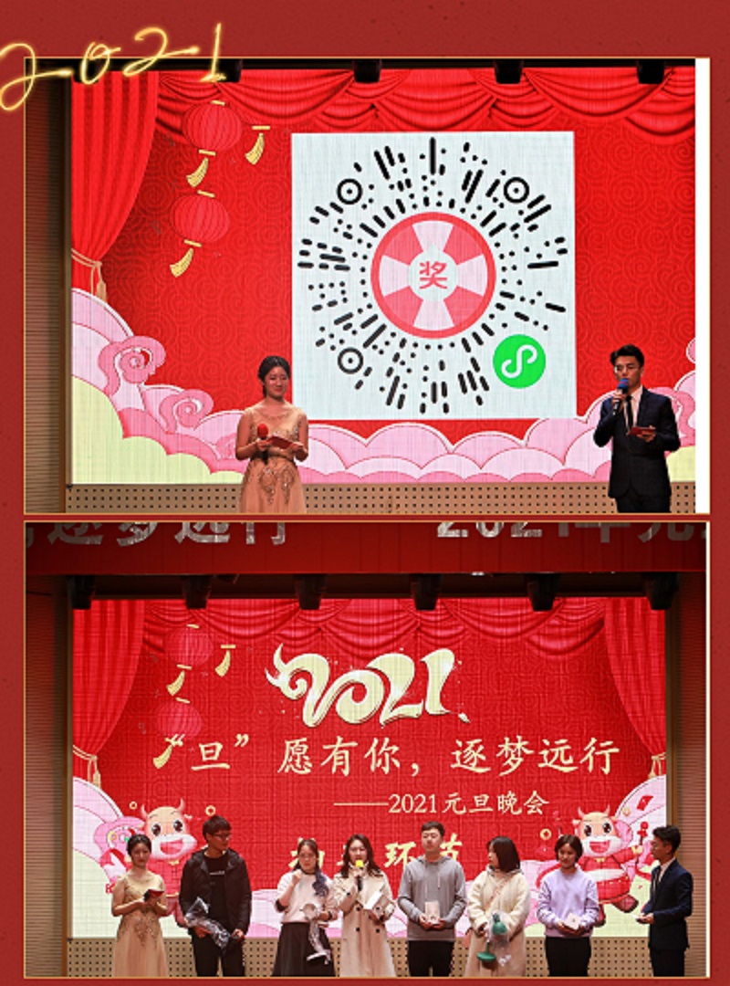 晚会现场分篇章抽取了一、二、三等奖及众多参与奖,六位老师登台抽奖并表达了对同学们的新年祝福。多样的抽奖形式以及称心的奖品惹得二十余位获奖者欢喜连连。至此,“旦”愿有你,逐梦远行—2021年元旦联欢晚会圆满落下帷幕。
