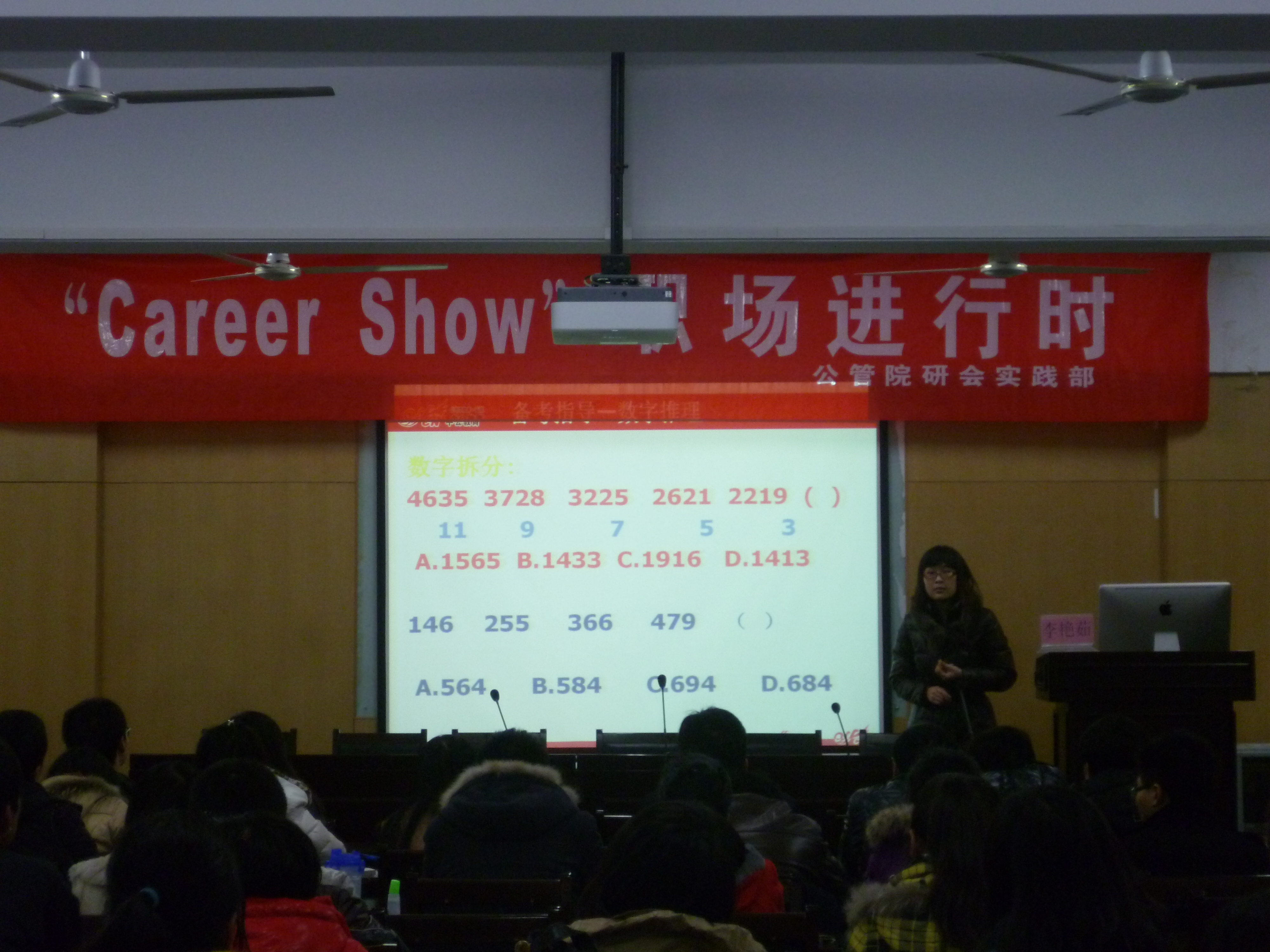 为了帮助想要考公务员的同学更加深刻了解公务员考试的题型和流程,备战2012,2月29日晚七点,第三期“career show职场进行时”公务员备考讲座在逸夫楼7021举行。主讲人是中公教育的资深老师李艳茹。这次讲座由公管院研究生会实践部主办。