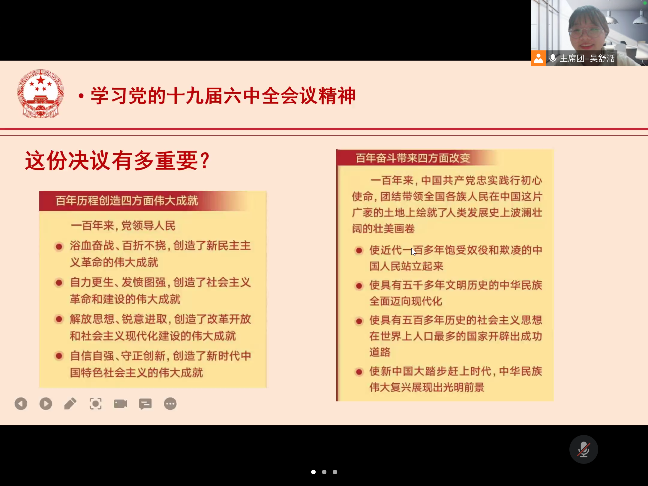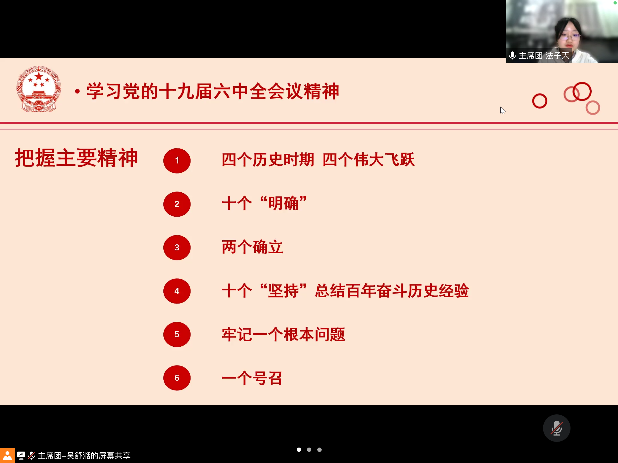 本次会议分为两个篇章。第一篇章为学习党的十九届六中全会会议精神,旨在提高学生会工作人员的政治素养,指明以思想武装头脑的方向,履行学生组织思想引领的职能。