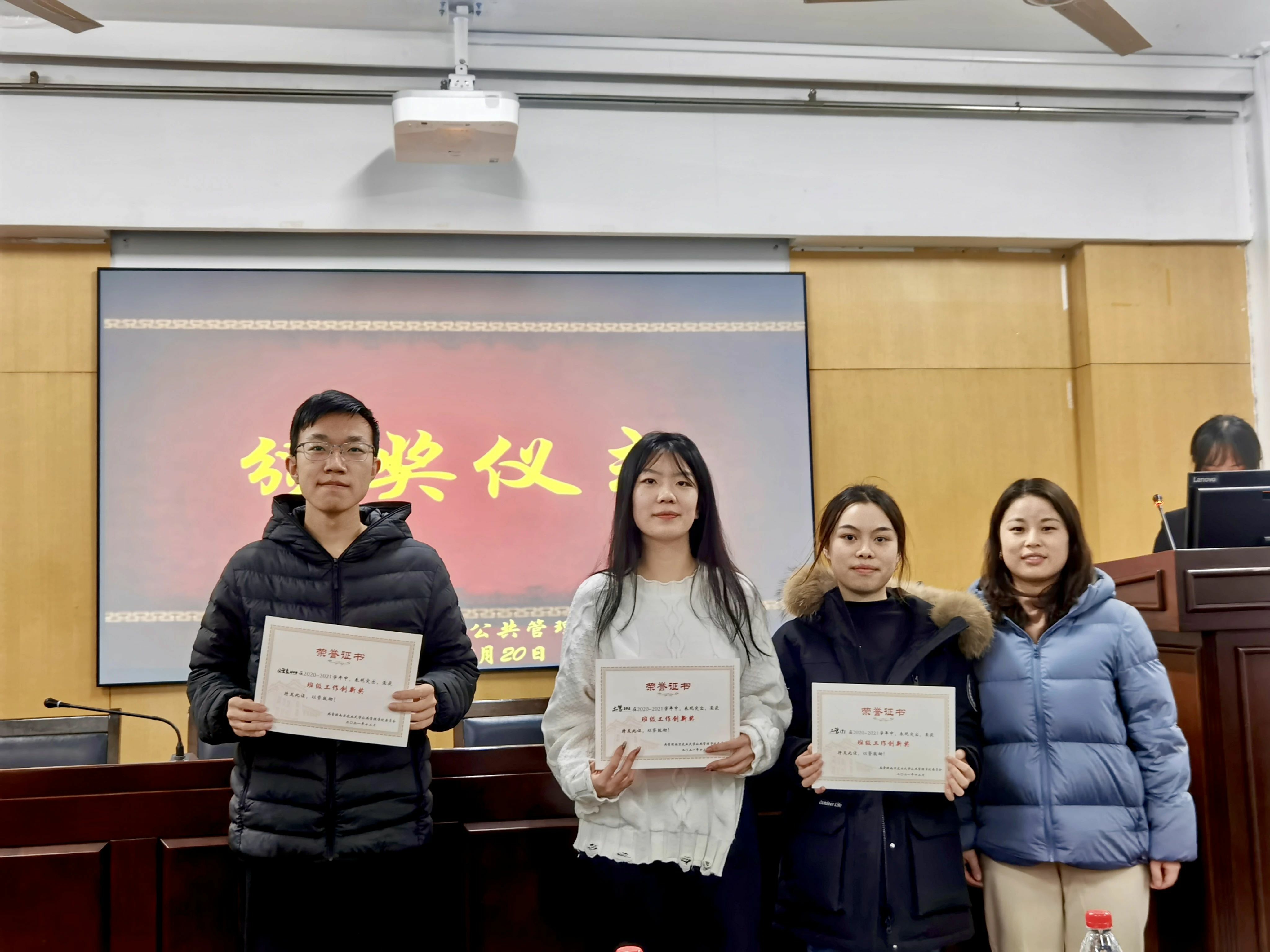 土管191班、土管202班、公管类2104班由颜玉萍老师颁发“班级工作创新奖”;人力191班、行政201班、公管类2105班由汪浩老师颁发“班级活动风尚奖”;土管193班、保障191班、人力201班、公管类2106班由张树峰老师颁发“最佳班级奖”。