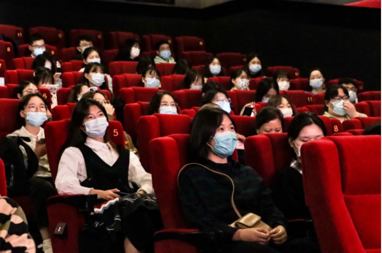 在影院,党员们抬着青涩的脸庞,仰视着他们父辈的火热青春。
