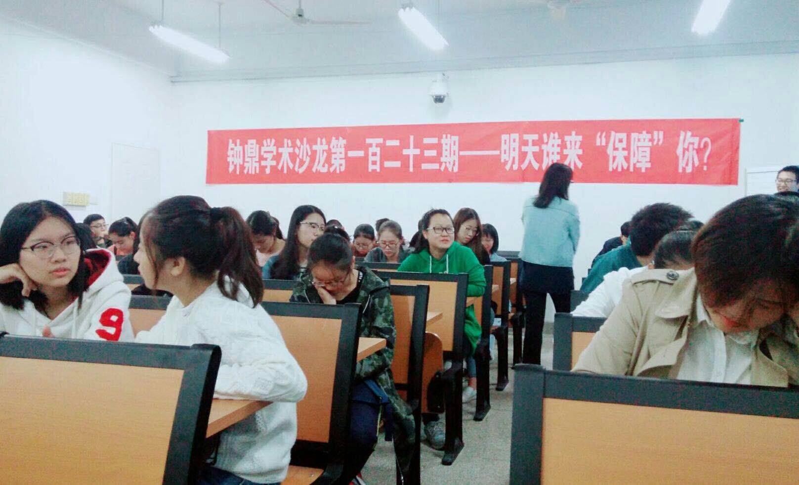 为了使保障专业新生加深对专业的了解,及时制定未来规划,并为保障专业所有学生提供思想交流的平台,引导学生多关注他们身边的社会保障问题以及相关的社会保障政策,提高自身专业水平。10月27日14:00,由437必赢会员中心学习发展中心主办,16、17级保障班承办的第一百二十三期钟鼎学术沙龙在教学楼b305举办。活动特别邀请了我院人保系系主任周蕾以及两位优秀的大四本科生,薛梦颖和李雪蕾。