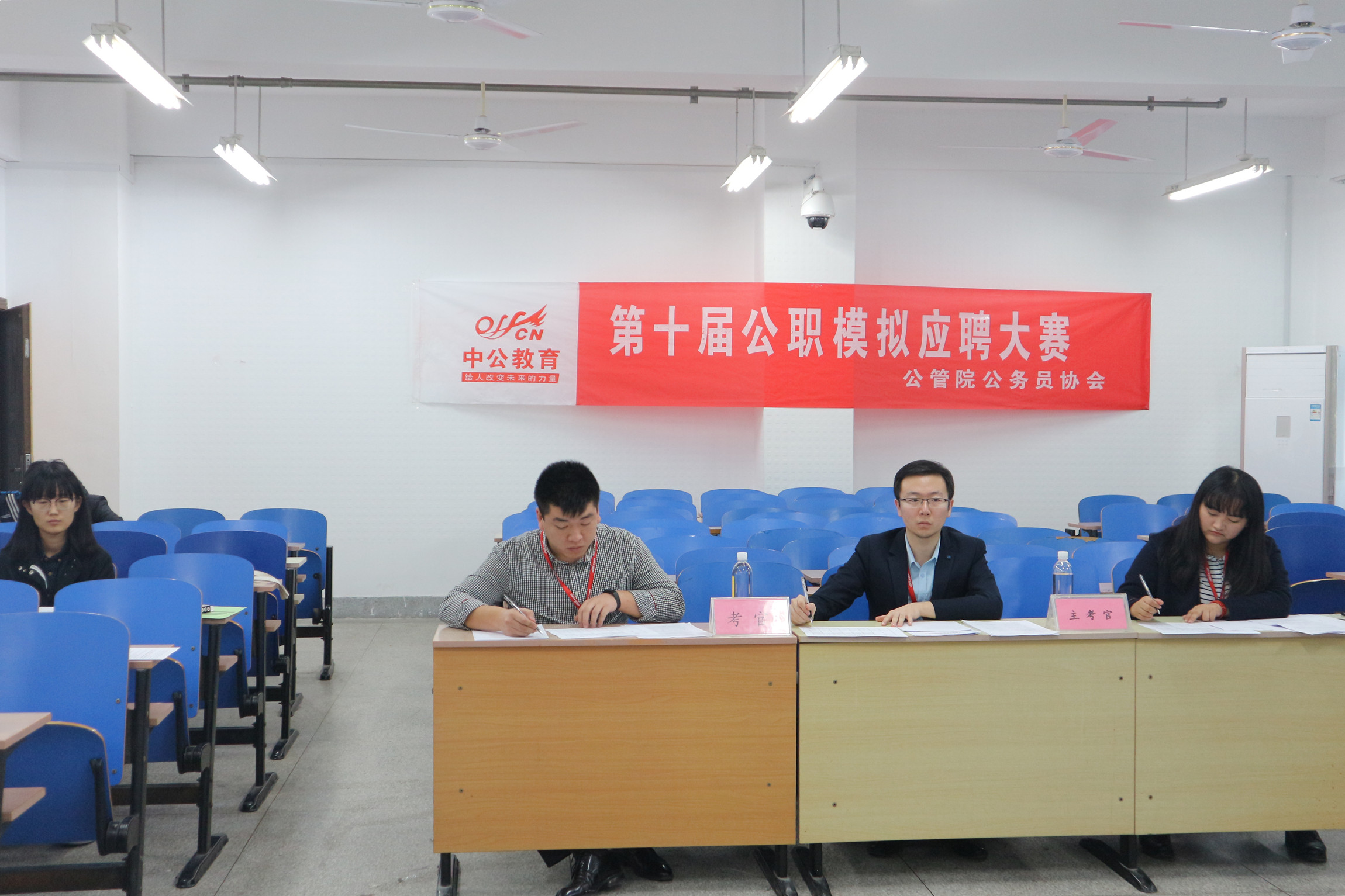 11月1日14:00,由437必赢会员中心联合江苏省中公教育主办,公管院科协公务员协会承办的第十届公务员模拟应聘大赛决赛在教四楼B303举办。此次比赛由中公面试辅导专家鲍巧汶、杨顼和刘鹏担任评委,自复赛中脱颖而出的13名选手参与了比赛。