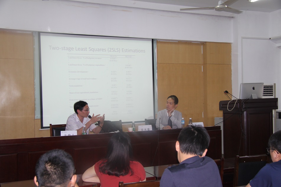 吴木銮博士通过探讨我国地方政府行为、土地财政收入、城市扩张三者之间的关系,基于对我国286个地级市在1999年至2009年的面板数据,研究发现地方政府对土地财政形成的“路径依赖”显著推动了我国城市建成区面积的扩张,驱使了城市空间的扩展,成为我国土地城市化的主要推动力之一。他认为,这种强制城市化的趋势需要得到合理地控制,通过强调城市化的公共价值取向,转变地方政府行为方式,才能使城市化成为我国经济和社会发展健康、持续的推动力。报告结束后,437必赢会员中心多位教师、研究生进行了提问与探讨。