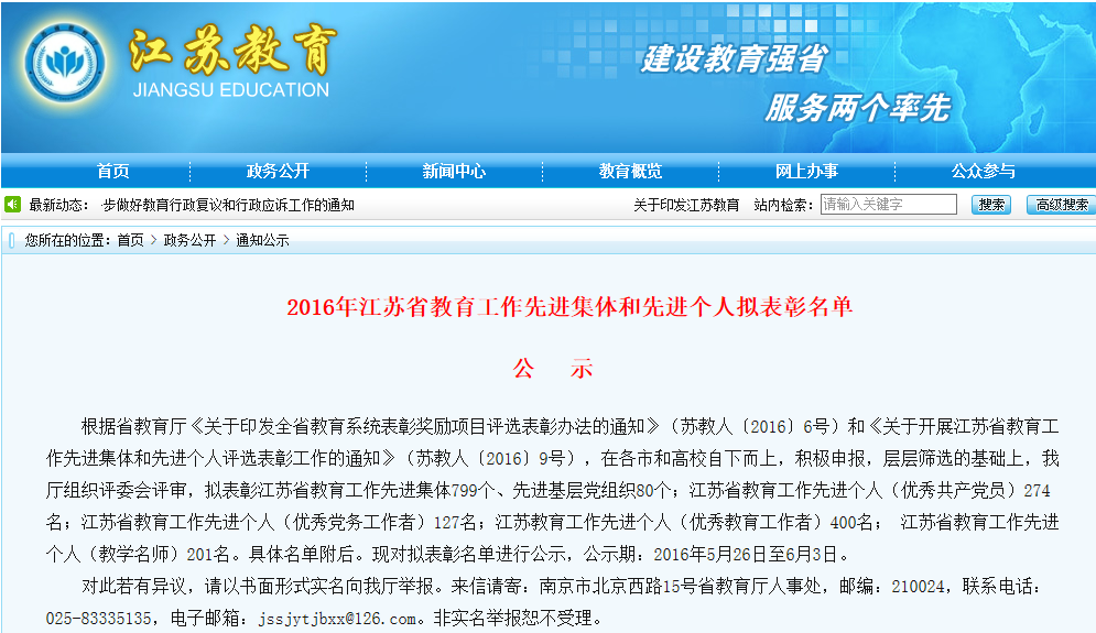 据悉,此次“江苏省教育工作先进集体”和“江苏省教育工作先进个人”的评选是为了全面落实省委省政府和教育部部署要求,为表彰先进、推动发展,在各地各校层层推荐的基础上,经组织评审出879个先进集体和1002名先进个人。