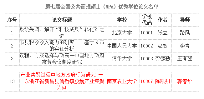公共管理硕士学位论文是MPA培养的重要环节,是MPA教育成果的集中展现。为提高MPA教育质量,扩大MPA教育的社会影响,全国公共管理专业学位研究生教育指导委员会于2016年11月启动了第七届全国公共管理硕士优秀学位论文评选工作。此次评选活动得到了各培养单位的大力支持和积极参与,共有102所院校推荐了260篇论文参评。经过国内专家严格评审,最终有20篇获得全国优秀论文奖励,我院陈凯翔同学的学位论文榜上有名,经全国MPA教指委在其官网上完成公示,最终于2017年6月1日做出表彰决定。