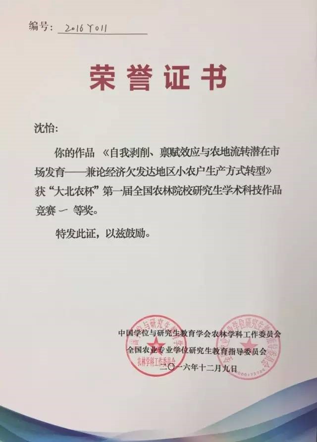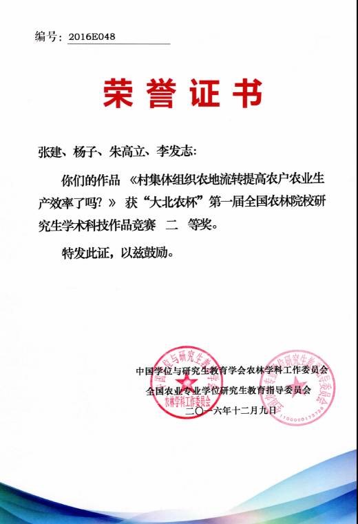 近日,我院硕士研究生沈怡同学作品《自我剥削、禀赋效应与农地流转潜在市场发育》荣获第一届“大北农杯”全国农林院校科技作品比赛决赛一等奖。我院博士研究生张建等同学作品《村集体组织农地流转提高农户农业生产效率了吗?》荣获“大北农杯”全国农林院校科技作品比赛决赛二等奖。
