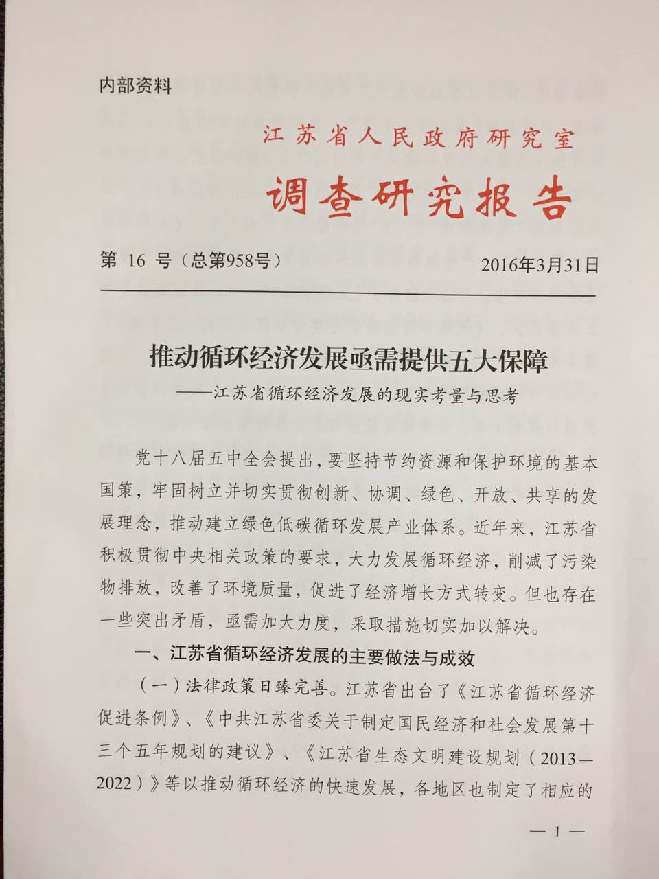 《规划》分析了南京市循环经济发展基础以及面临的挑战,提出了南京市循环经济发展的具体对策建议,既为推进南京市“十三五”循环经济发展提供了科学指导,也为南京市“十三五”规划编制工作提供了有效的智力支持。《规划》成果具有较强的科学性、前瞻性、创新性、指导性和可操作性。其研究的阶段性成果刊登在江苏省人民政府研究室内刊《调查研究报告》上(2016年3月31日,第16号),报送中共江苏省委、省人民政府领导。