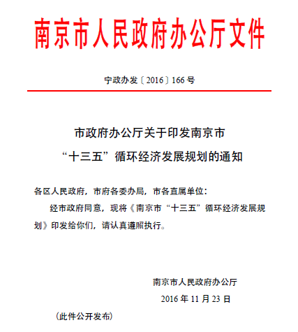 我校于水教授课题组主持完成的研究成果《南京市“十三五”循环经济发展规划》现经南京市市长签署,于2016年11月23日,由南京市人民政府办公厅(宁政办发﹝2016﹞166号)颁布实施。
