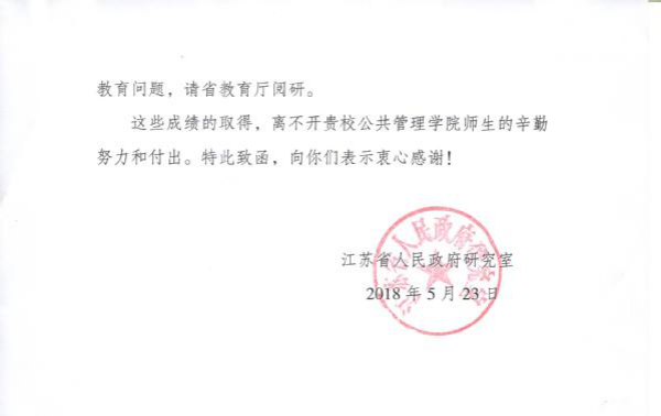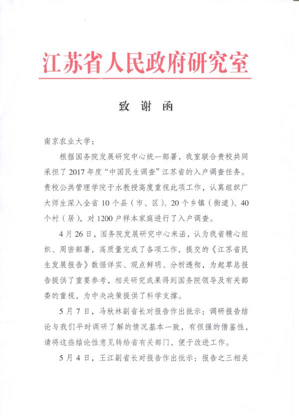 近日,收到江苏省人民政府研究室发来的致谢函,我院于水教授研究团队在国务院发展研究中心中国民生发展指数研究项目资助下,完成的2017年江苏省民生调查系列报告获国务院、省领导高度肯定与批示。