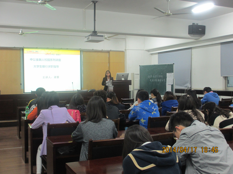 2014年4月17日晚,我院科协公务员协会在逸夫楼7021开展大学生银行求职指导讲座。由中公银行资深讲师梁晋老师担任主讲,讲座主要从银行就职的基本信息、就职银行的渠道以及就职准备等三方面展开。