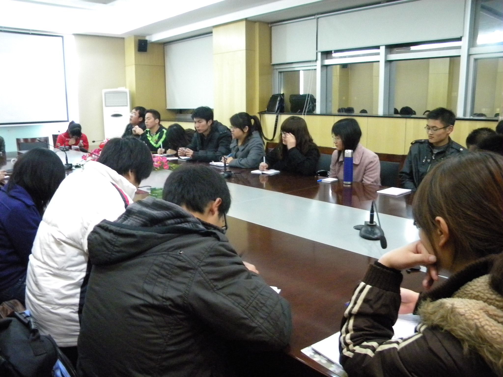 4月15日晚9点,于逸夫楼7028召开了学习部、英语协会、公务员协会、创业者协会四个部门的交流会。参与会议的主要有学生会主席卢拉沙,各个部门的部长,部分副部及干事。而辅导员汪浩老师则在开会期间到场给大家讲了几句,主要讲到相信大家能做好这份工作,而具体的要求就交由卢拉沙给大家指出。