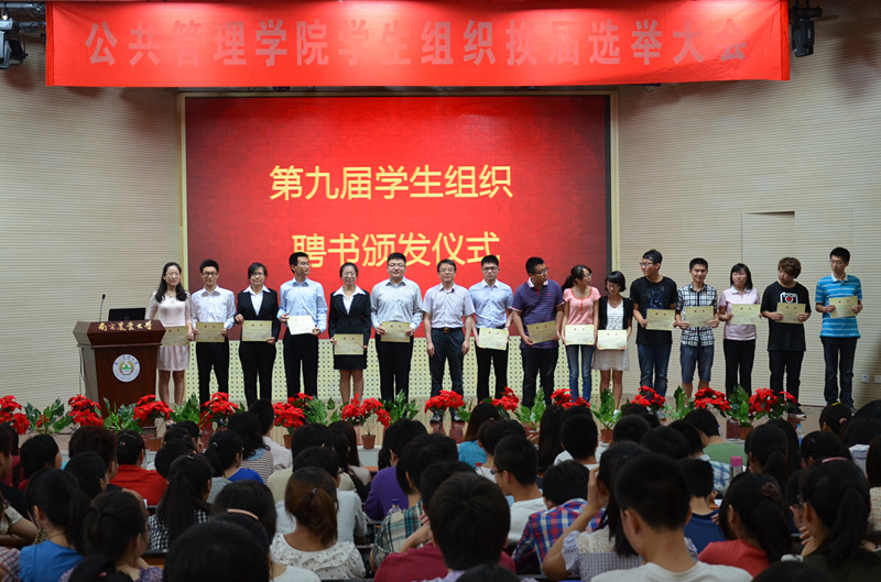 首先,学生会主席周延、团委副书记李梅和赖映圻、科协主席宋厚承以及学通社社长李浩华代表四大学生组织上台述职,他们对去年四大部门分管的学生工作情况作了汇报总结,并对学院领导支持表示了感谢。随后,院党委书记吴群为第九届学生组织成员颁发了聘书。