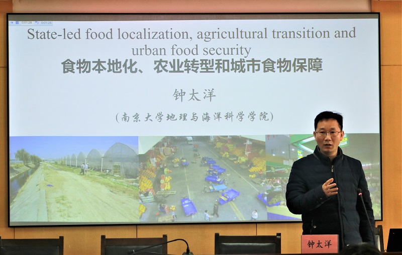 在很多关键领域的改革任务,除了基础层面、体系层面和文化层面外还有很多方面需要改变,如农业基础不够稳固等。由此,南京大学地理与海洋科学学院的钟太洋副教授带来了以“食物本地化、农业转型和城市食物保障”为题的报告。钟教授首先引入“粮食安全”的四大支柱:粮食供应、获得粮食的机会、粮食稳定性和粮食利用,然后介绍了食物本地化的概念,并以南京市为例展示了中国的食物本地化的社区化和园区化这两种形式。此外,还以南京市为例介绍了农业转型带来的结果:大棚化、商品化、外来化与职业化以及租佃化。最后,钟教授提出城市食物保障要扩大地方批发市场、构建物流化的食物零售市场。此次报告让大家对我国食物保障与农业转型有了进一步认识,更加明确了我国公共管理中农业改革创新的任务以及我们当代青年肩负的责任。