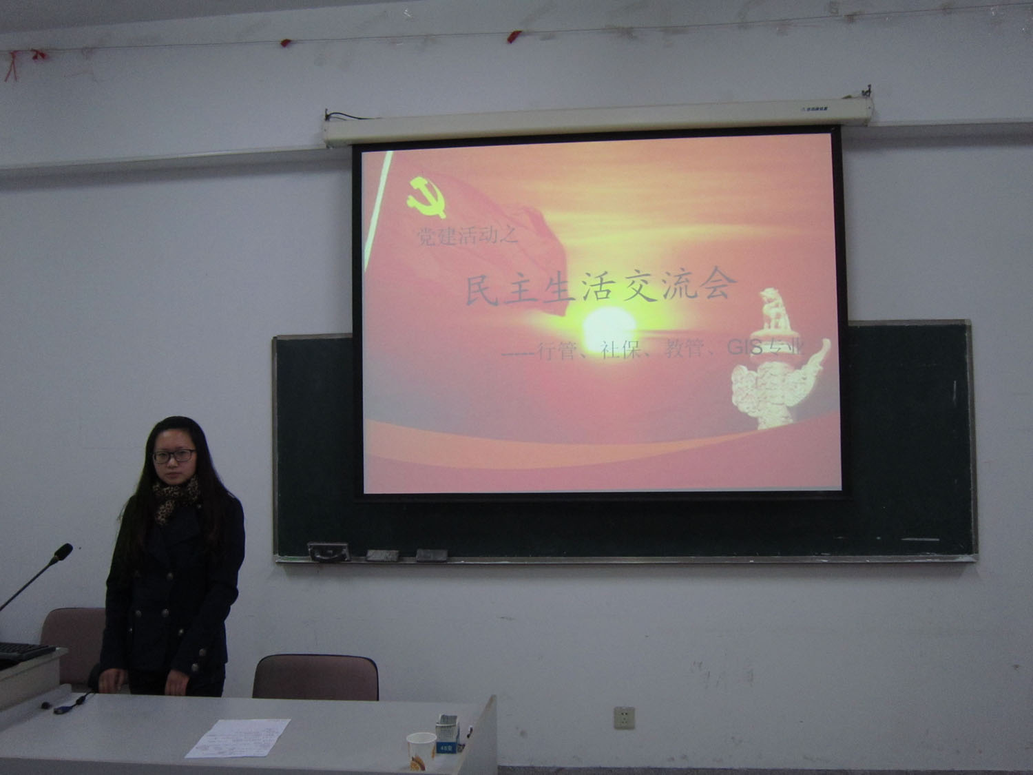 2012年3月21日,行管、社保、教管、GIS支部民主生活交流会在逸夫楼7051举行。交流会上,支部成员观看了中国社会主义建设时期的历史纪录片。纪录片长50分钟,主要回顾了从1949年新中国成立到改革开放前的社会主义建设时期这一段历史,其中涉及到“一五计划”的实施、三大改造、八大召开、“大跃进”、文化大革命、拨乱反正等重大事件。新中国的建设取得了一定的成就,有成功的经验,但也有失败的教训。概括来说,中国社会主义建设在曲折中前进。