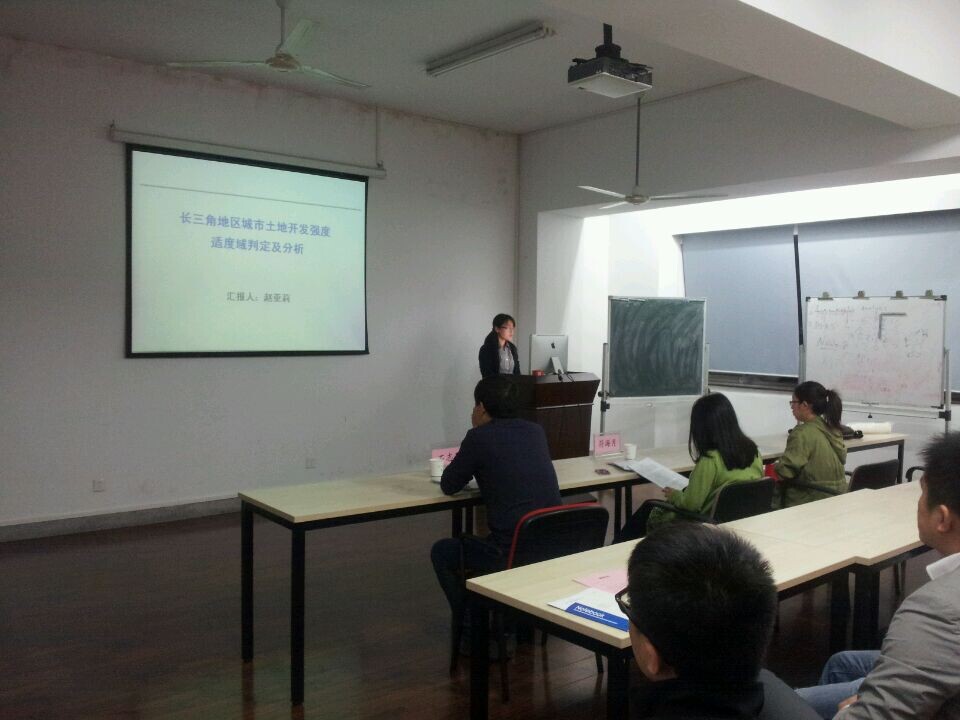 晚7:00,会议准时开始。主持人用简短的语言表达了对到场嘉宾和同学的欢迎之意。接下来由尹雪英、赵亚莉和孙雪峰分别对其论文《农地股份合作社是具有中国特色的现代农业合作社》、《长三角地区城市土地开发强度适度域判定及分析》、《基于土地综合整治项目平台的农村宅基地退出机制研究》进行了汇报,点评老师对三位同学的主要观点表达了自己的看法,其中有对学生的认可,也有对其的不足的进行了批评和指正。座位上认真聆听的同学也积极参与论文的交流与讨论,根据各自感兴趣的话题表达了自己的不同意见和建议。整场论坛在师生们热烈的互动交流中持续进行。最后,本期论坛以师生合影留念的方式落下帷幕。
